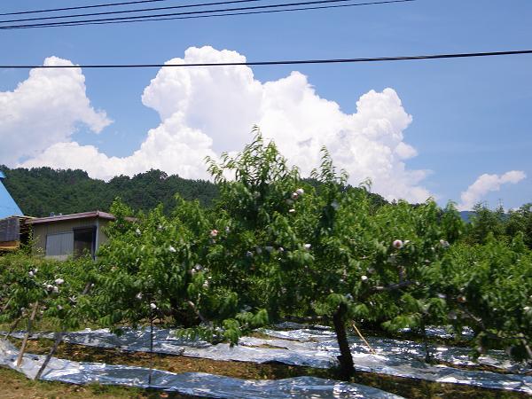 入道雲がもくもく。いまさらながらもう夏なんだなぁ。沿道はぶどうや桃の畑が並ぶ。