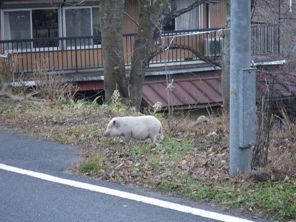 中途のみはらし屋(そば処だったか?)のそばに豚がうろうろしていた。