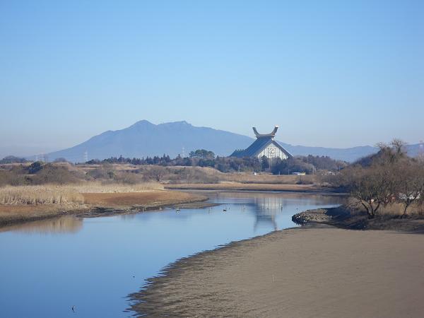 宗教施設風の建物。向こうに見えるのは筑波山?