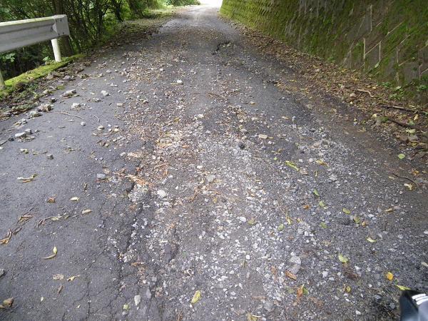 まず路面状況。舗装路では今まで走った峠道でも、最凶の荒れ具合。