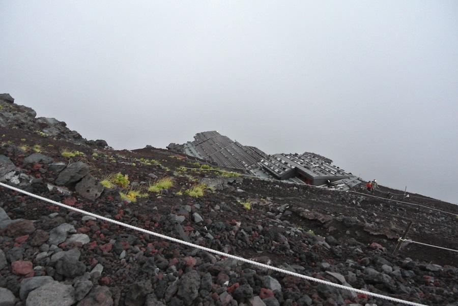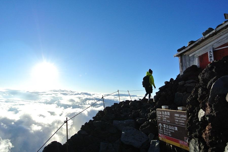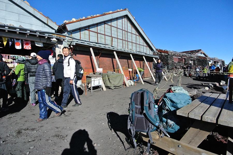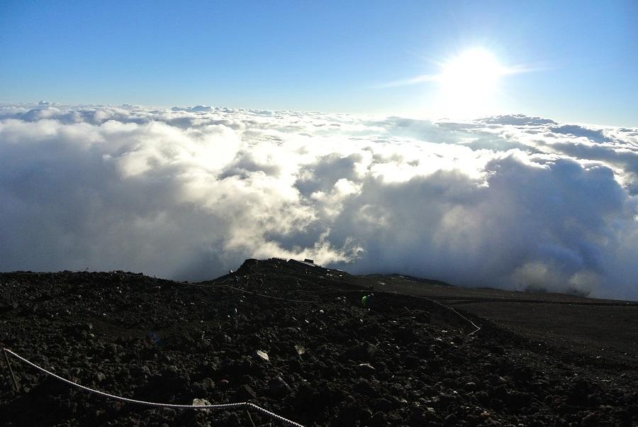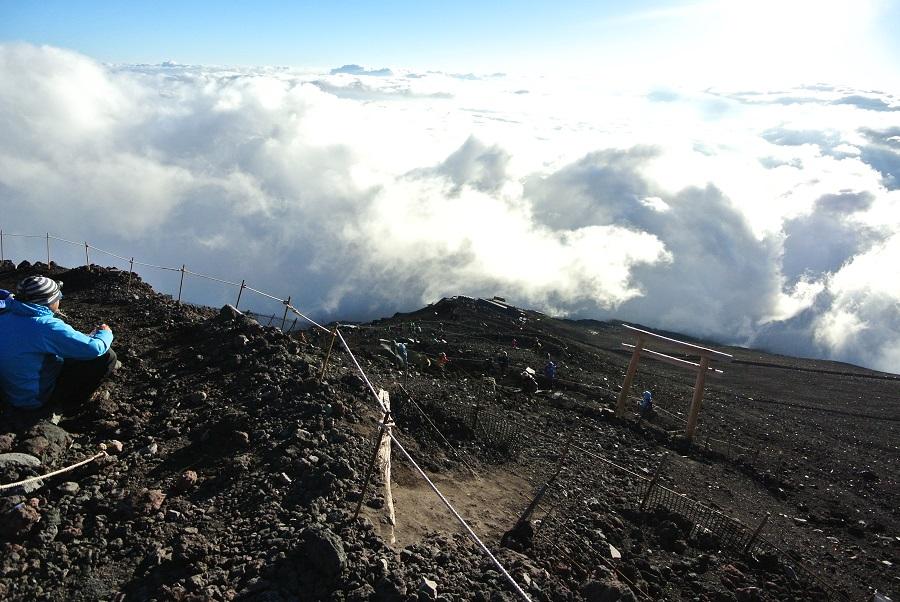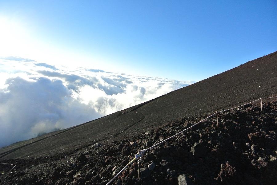 急斜面では、自転車でペダルを踏み込む時みたいに腰を曲げて上体を太股に近づけるようにして上ると楽になる気がした。ただ、これを続けていたら股関節に負担がかかるみたいで、8合目をすぎると内転筋が痛くなってきた。間接系の痛みではなく、筋肉の痛みなので、あまり気にせず進む。歩幅を小さくして上るように変えると、少しましになった。