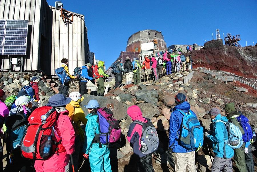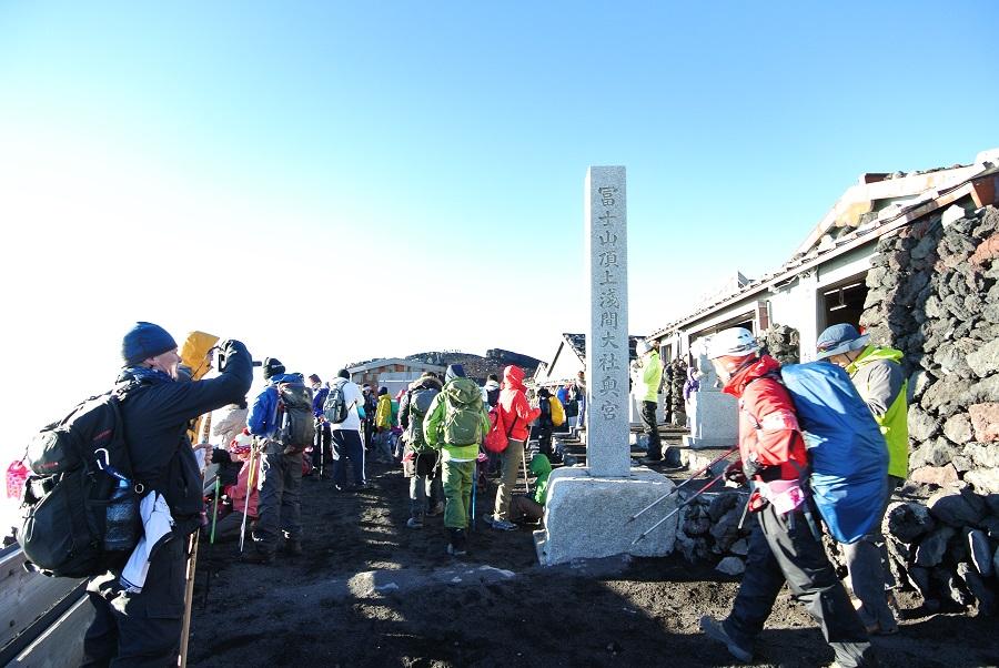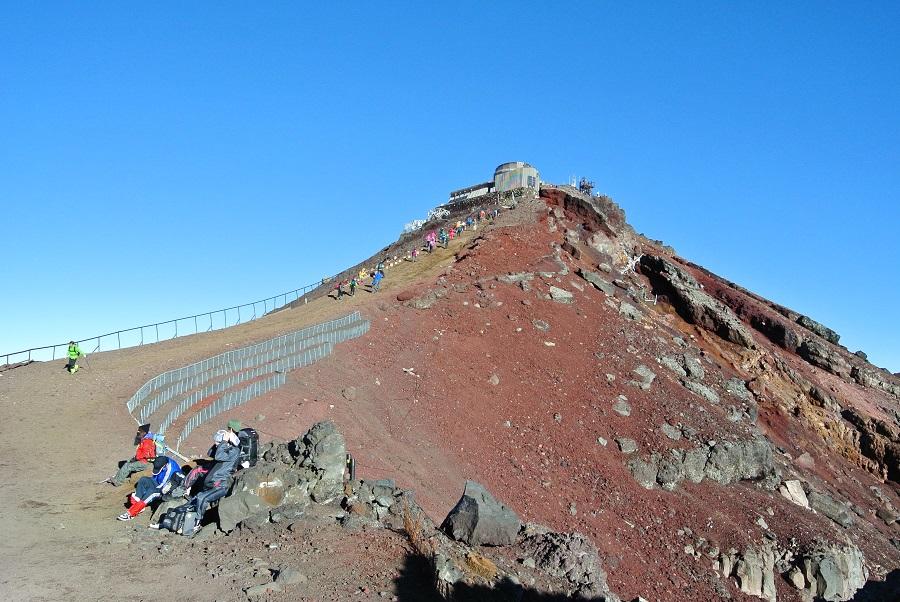 剣が峰06:57。長蛇の列があって何かと思ったが、最高地点で写真を撮る順番待ちだった。ちょっと惹かれたが、時間がもったいないのでスルーした。