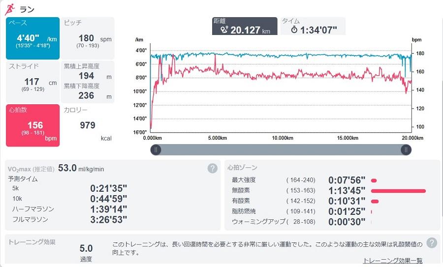 シューズはいつものゲルカヤノ。なるべく同じくらいのペースでちょうど20km走れそうな無理のない強度で走る。だいたい1㎞を4分30~40秒くらいですべての周回を走った。後半落ちたりはあまりしなかったので、イーブンペースで走るのはわりと得意なのかも。